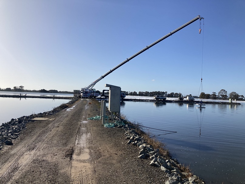 Work continues to put the third pump in place to continue recirculating fresh water throughout three main wastewater treatment lagoons.