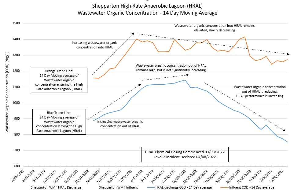 We’ve plotted a graph of the performance of the HRAL during the odour incident showing data on a 14-day average. The blue line shows the water leaving the lagoon – the line trending downwards shows the improvement in treatment. Under optimal treatment processes, the gap between the orange and blue lines should be as large as possible.