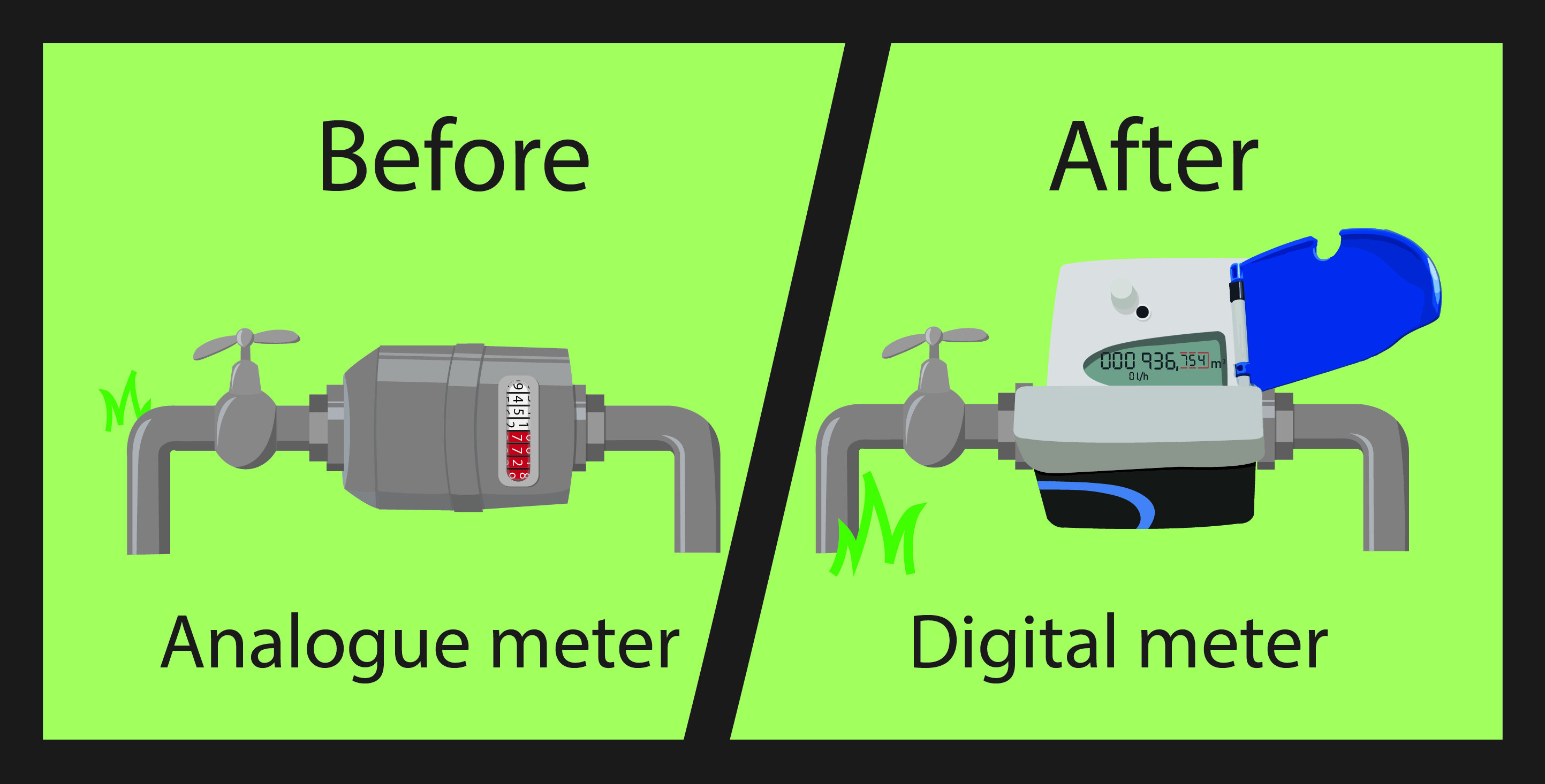 Installation will involve removal of the existing analogue meter, and immediately replacing it with a new meter. Customers can expect up to 10-15min water supply interruption, but will be advised when this is occuring.