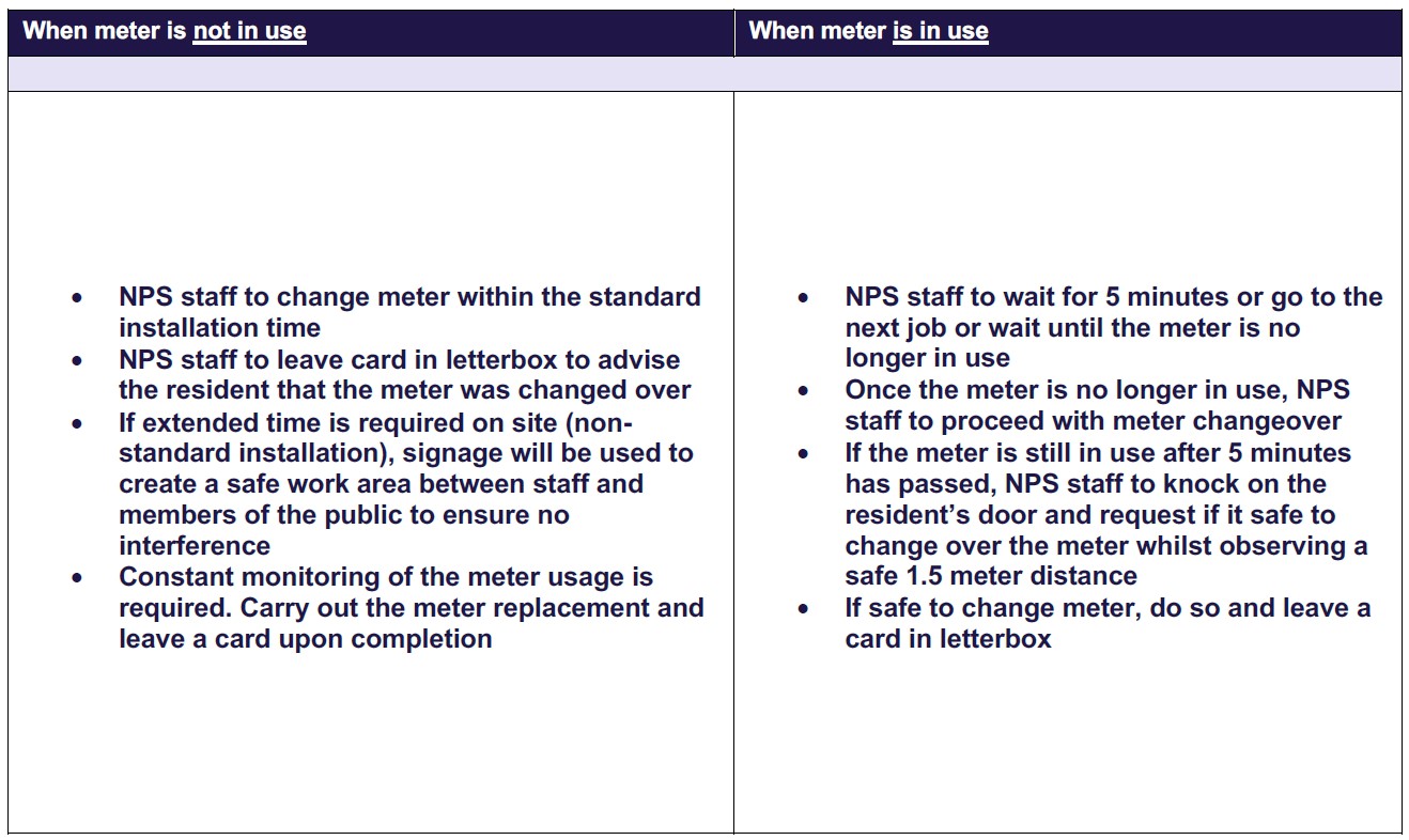 Please note that NPS will no longer be door knocking at customer properties to advise that they are onsite, instead they may knock on occasions where water is running through the meter only, and will also be observing the 1.5m distancing rule.
