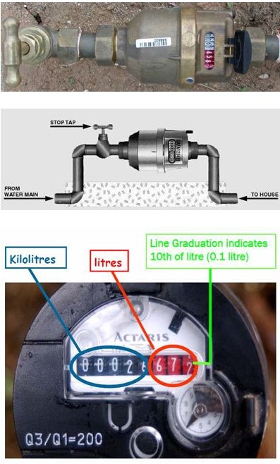 The analogue meters track water use in litres, and the usage is read every four months by a contracted meter reader. They do this by walking from property to property, and checking and recording the reading.This data is then fed into the system, and an account is generated based on the difference between the previous read, and the current read.