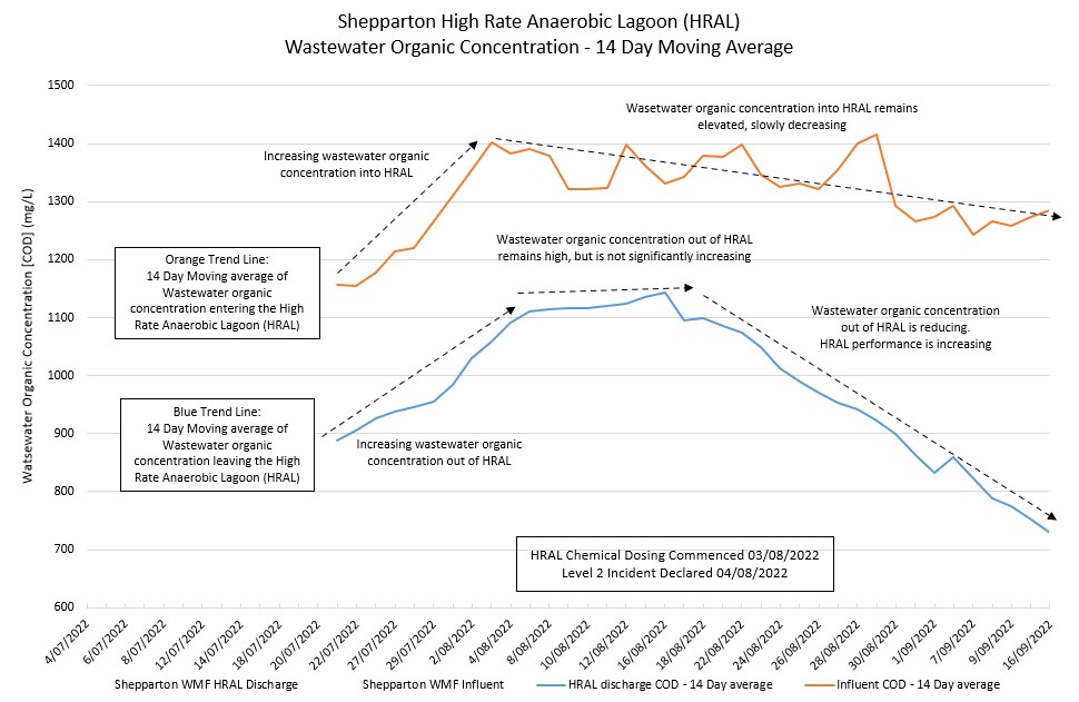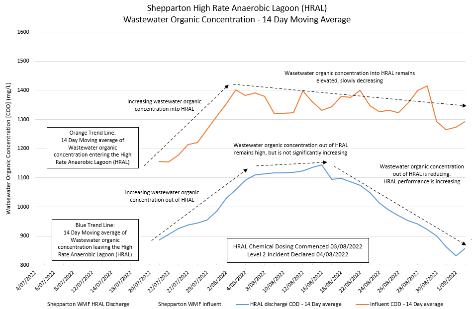 We’ve plotted a graph of the performance of the HRAL during the odour incident showing data on a 14-day average. The blue line shows the water leaving the lagoon – the line trending downwards shows the improvement in treatment. Under optimal treatment processes, the gap between the orange and blue lines should be as large as possible.