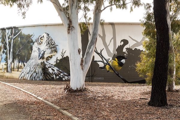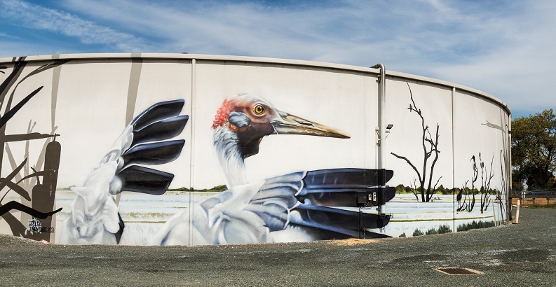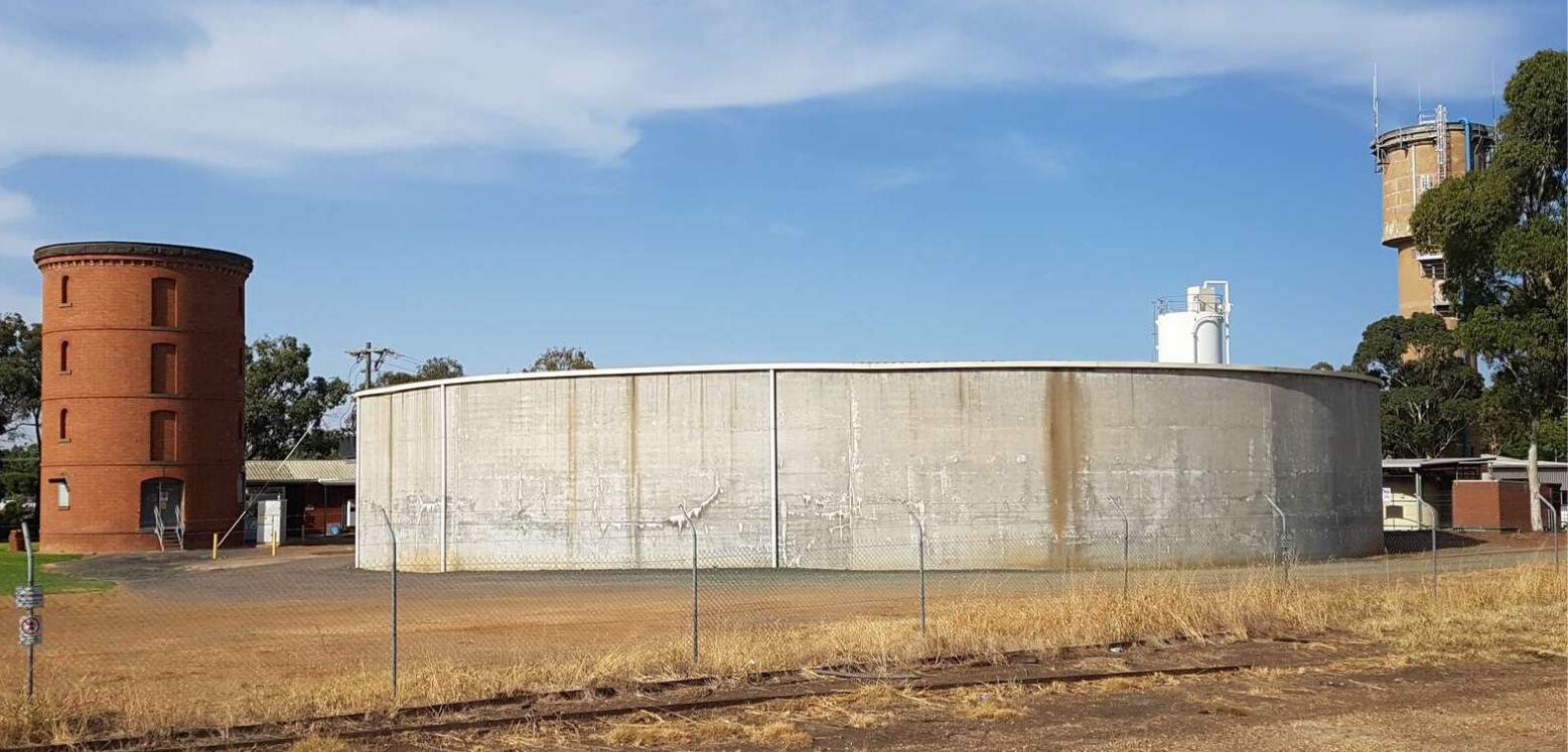 The photo below captures all three eras of the Kyabram Water Treatment Plant - the 1890 red brick tower, the 1928 concrete water tower and the clearwater storage tank prior to it becoming an art canvas.
