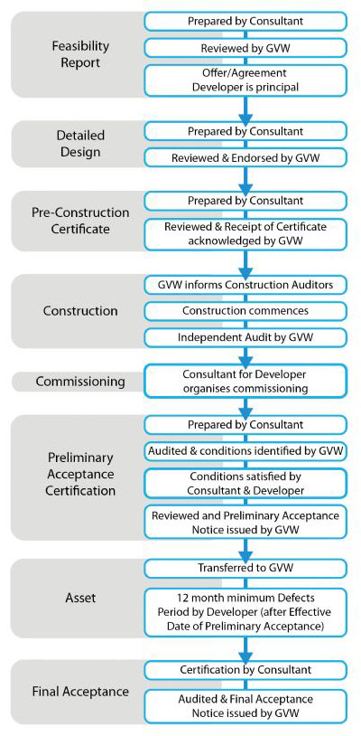 When land is sub-divided or new land extended, the developer is required to arrange for the installation of water and sewerage services. The developer must appoint a consultant accredited with us to construct the development works. In addition to meeting the costs of services to the sub-division or extension, the developer is required to pay New Customer Contribution (NCC) charges which are a contribution towards the water and sewerage assets that service the property.