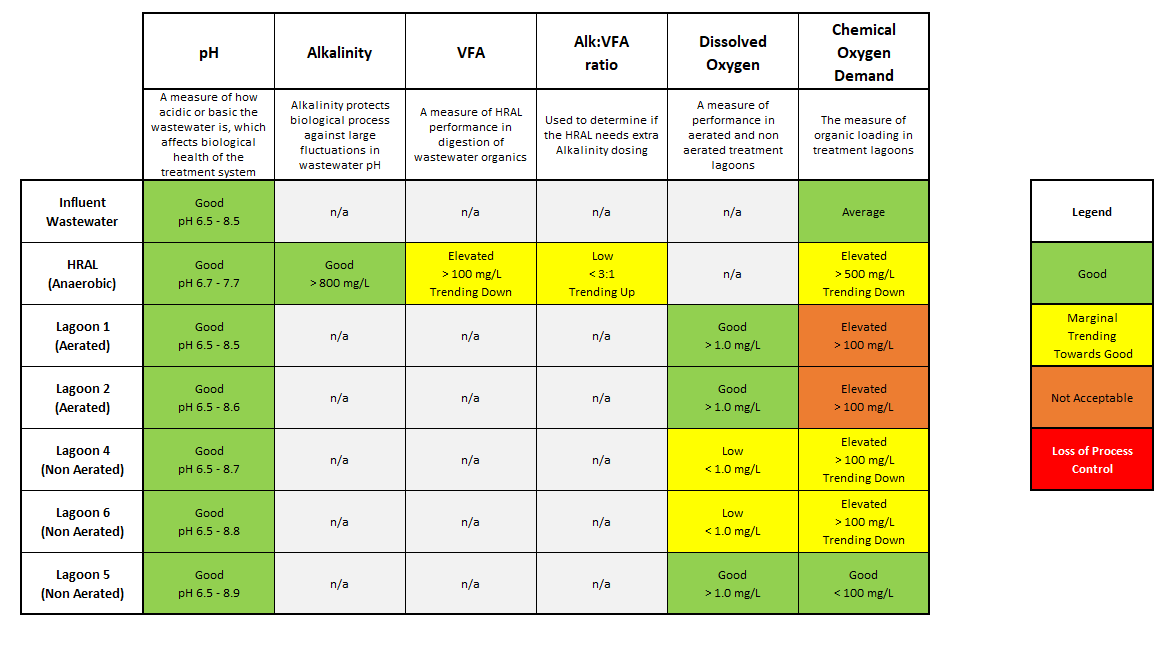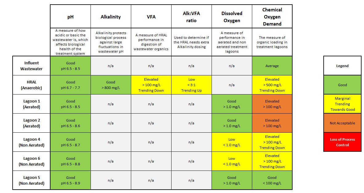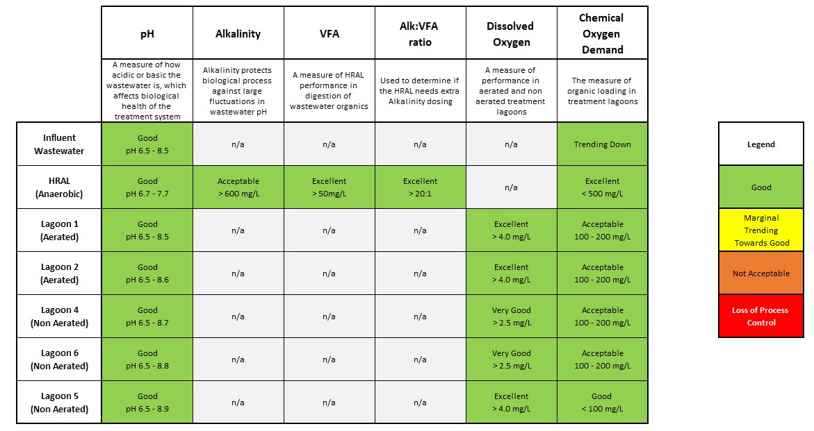 We’ve also mapped our key performance indicators, which shows key data we’re looking at during wastewater sampling in the main treatment lagoons, including pH levels, alkalinity levels, VFAs (volatile fatty acids), the VFA to alkalinity ratio, as well as dissolved oxygen and organic loading. We haven’t seen much change represented in the report during this past week – likely due to the long processing time across all treatment lagoons.